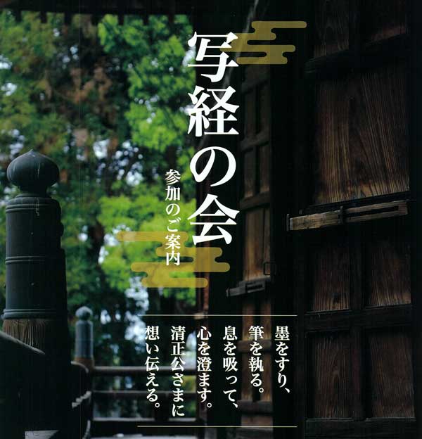 写経とは法華経の様々な修行の中でも、お経を書き写す『書写行』のことです。こころを落ち着けて書写行に臨むことで、日常生活での雑念、わずらわしい執着から解き放たれませんか。自分自身のこころと向き合い、ゆとりと喜びを育んでこそ、他人に優しくでき、穏やかな日常を送れる・・・。このことこそが仏さまの教えの根本であり、写経の功徳なのです。皆様に写経して頂きましたお経は7月23日の頓写会にて清正公さまに奉納いたします。