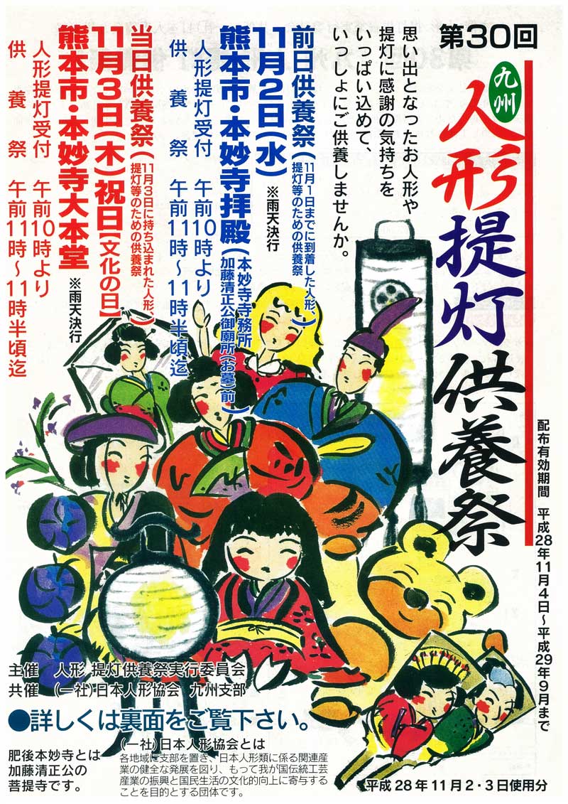 人形、ぬいぐるみ及び提灯は、このポスター、チラシのある協力店へお持ちください。その際供養料をお預けください。 また、人形、提灯を事務局へ直接送られる方は、ご供養料を同封の上、10月31日までに下記事務局まで送付下さい。 供養料は送付される段ボールの内側最上部に貼り付けてください。